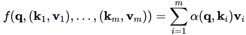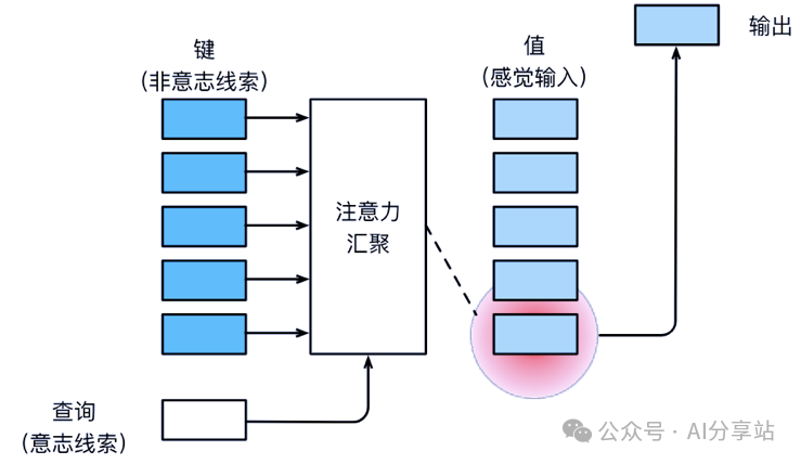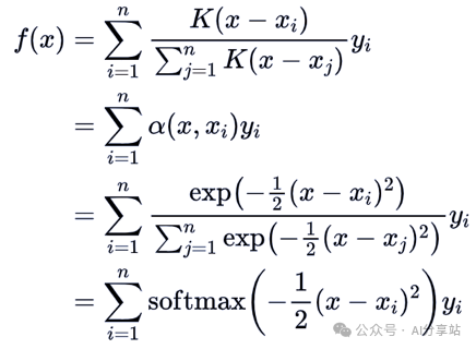 上面公式中,x 对应于 Query,xi 对应于 Key。如果 xi 越是接近 x,则分配给 xi 这个 Key 所对应的结果 yi 的权重就越大。同样可以推导出,一个 Key 越接近给定的 Query,那么分配给这个 Key 对应的 Value 的注意力权重就会越大,即获得了更多的注意力。