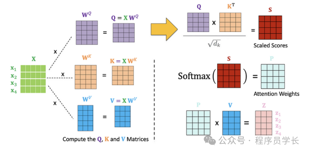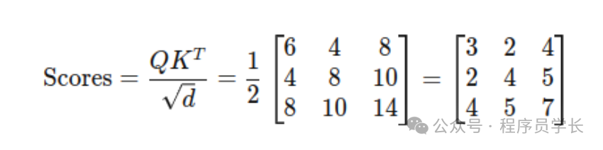 具体做法是将查询向量和键向量进行点积,并通过一个缩放因子归一化: