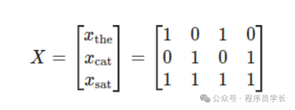 假设我们有一个由三个词表示的输入句子:“The cat sat”。为简单起见,每个词将有一个维度为 d=4 的嵌入向量。