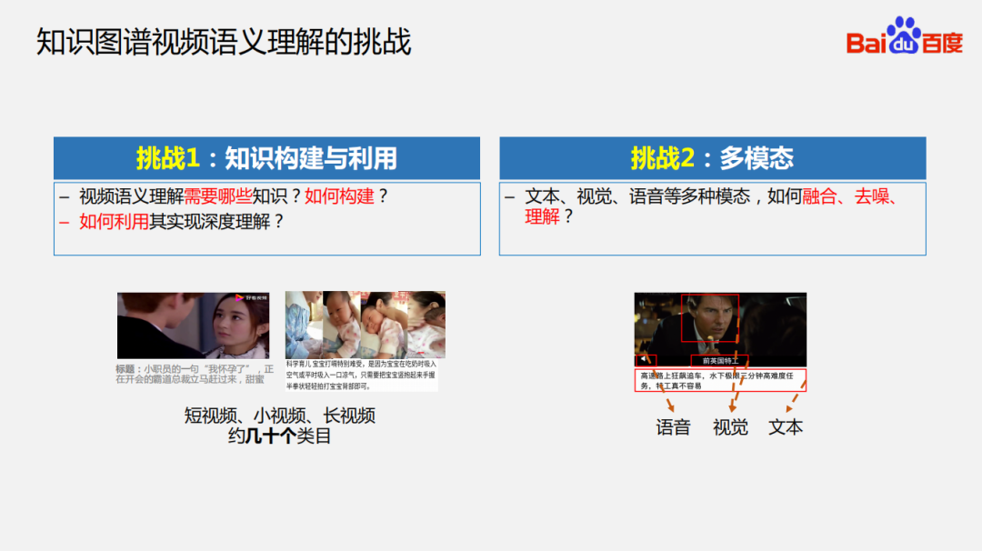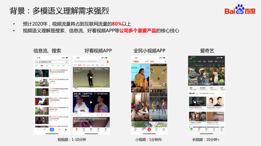 多模语义理解需求强烈。对于百度而言就有很多视频产品,比如信息流、全民小视频、爱奇艺等等,对应长视频、短视频、小视频等,这类视频的深度理解对于公司的视频业务,是非常核心的基础技术。