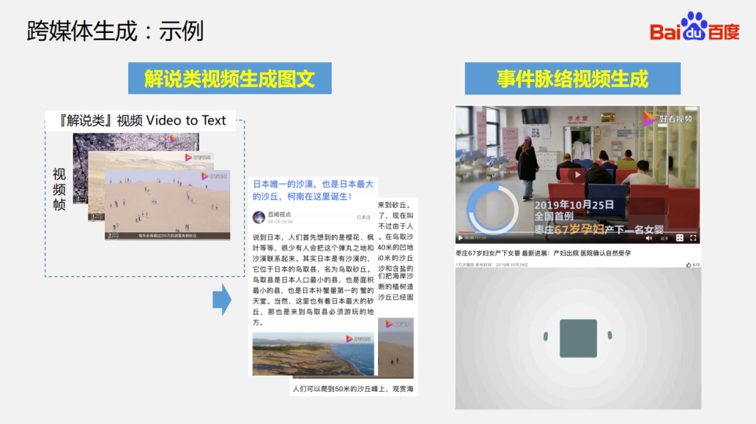 另一个工作是跨媒体生成,主要是在图文生成和视频生成。我们基于视频语义理解和知识图谱去提供生成所需要的素材、信号和知识来提升视频生成效果。