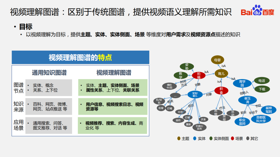 视频理解的目标是提供主题、实体、实体侧面、场景等维度对用户需求及视频资源点描述的知识,不同于传统的知识图谱,视频理解图谱在图谱节点方面更关注于主题、实体侧面、场景类的知识,以及这些知识的关系如属性关系、上下位关系和关联关系等;在知识来源方面专注视频搜索日志、用户评论、视频资源本身来挖掘图谱等;在应用场景方面更多关注视频推荐、搜索和内容生成等。