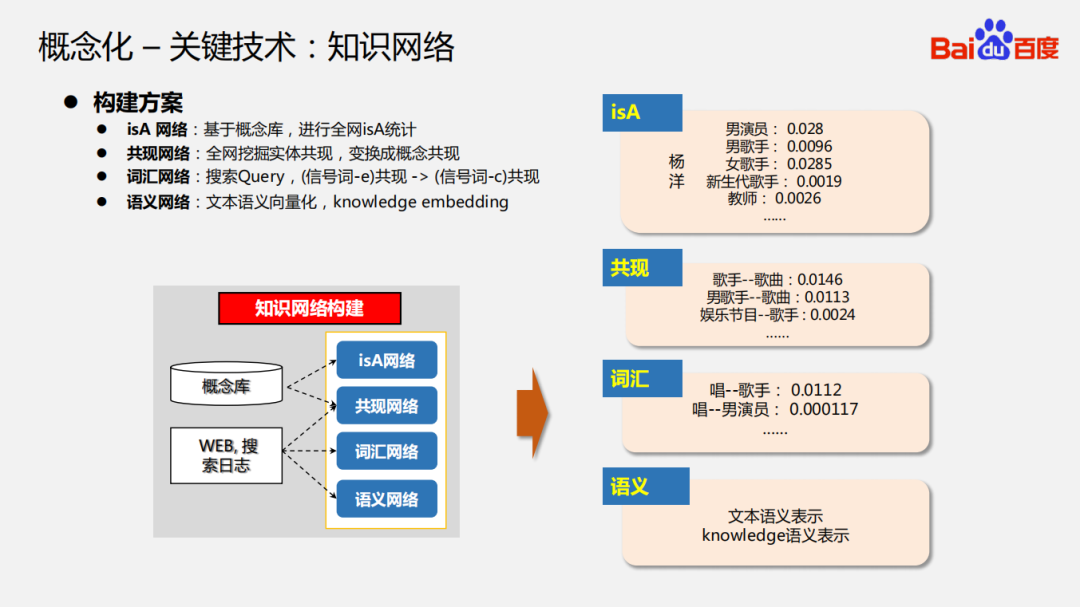 - 共现网络:挖掘全网下实体的共现,同时转换成概念的共现,比如歌手与歌曲的共现;