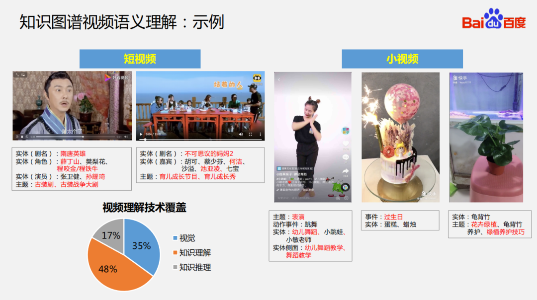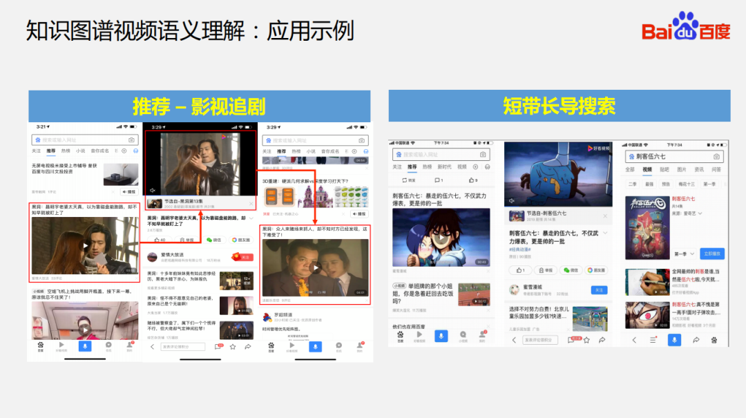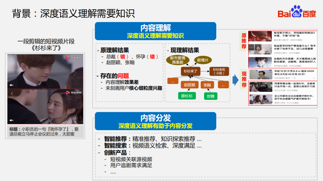在实际应用场景中,我们发现要实现视频的深度语义理解,在纯感知技术的基础上,知识发挥着重要的价值。比如上面的短视频片段,从内容理解来看,传统的视频理解更多是基于感知,比如通过人脸识别和从OCR识别出关键词/字。在实际场景中我们发现这些效果上还有较大优化空间,同时,这样识别出的结果没有刻画出用户对视频核心的细粒度兴趣,比如影视剧的角色、关系等知识。但是基于知识图谱的语义理解就可以解决这类的问题,它能够对视频做深度结构化的解析,然后上层的推荐、搜索可以应用这些知识作为特征辅助内容的高效分发。