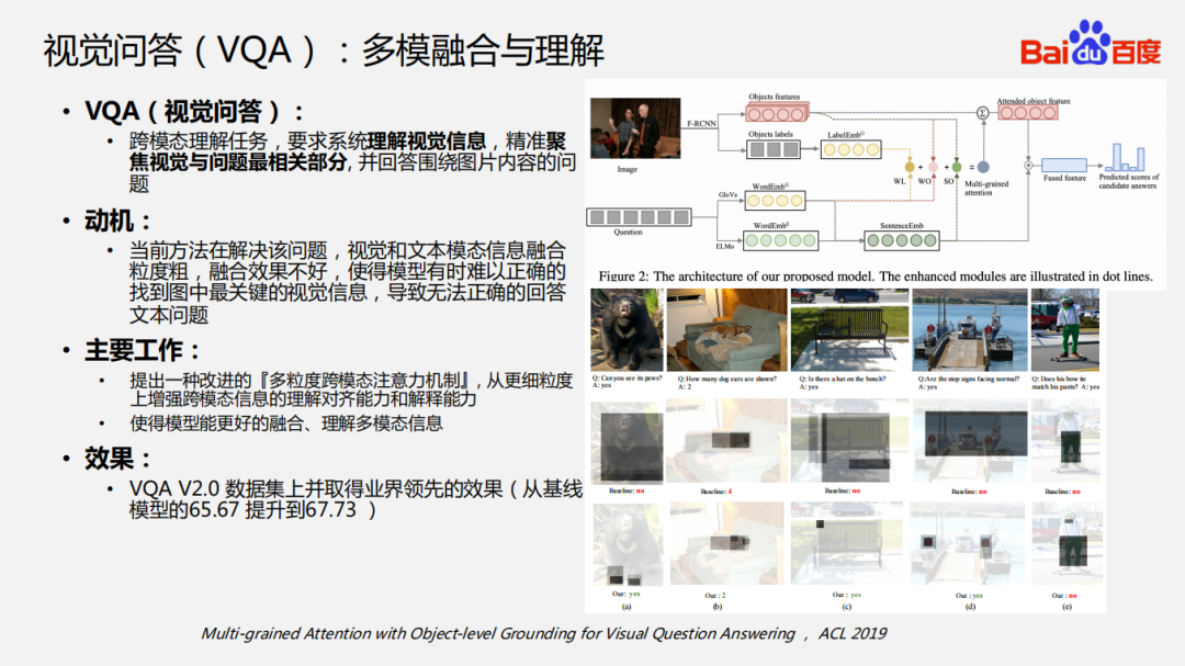 我们的主要工作是提出一种改进的“多粒度跨模态注意力机制”,从更细粒度上增强跨模态信息的理解对齐能力和解释能力。使模型能更好的融合,理解多模态信息。在VQA2.0上面效果表现良好,从65.67提升到67.73。