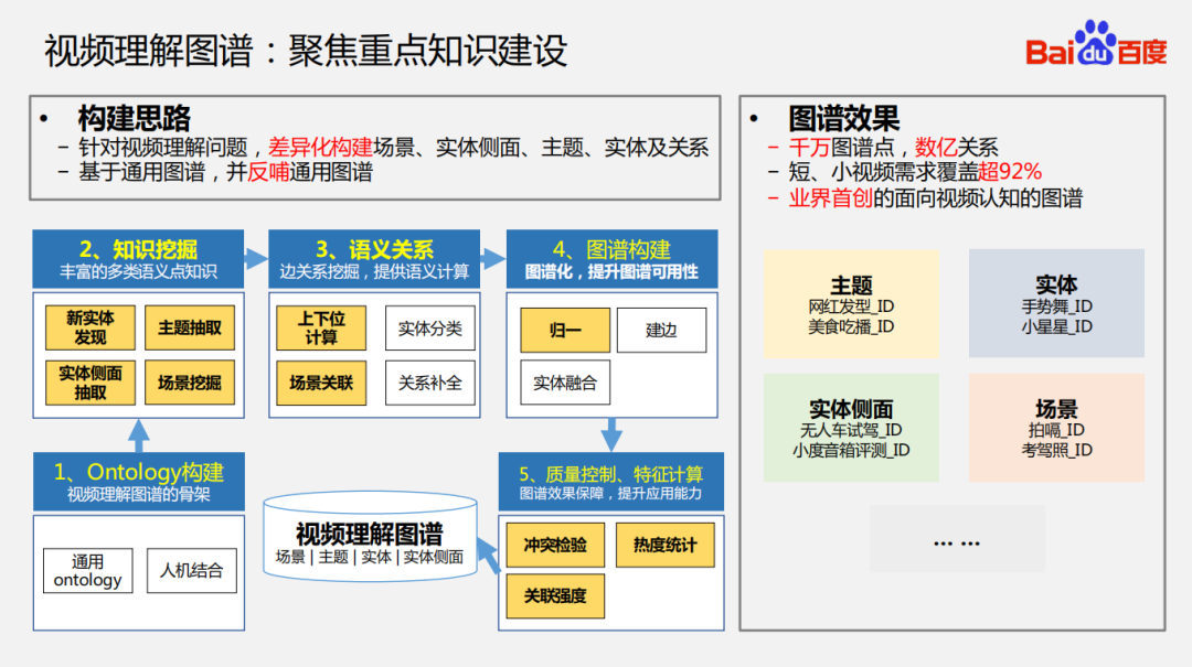 上面提到了视频理解图谱与传统图谱之间的关系,所以我们的构建思路就是差异化的构建,重点构建场景、实体侧面、主题、实体以及它们的关联关系,最后将这个图谱反哺到通用的图谱当中。整个过程如下: