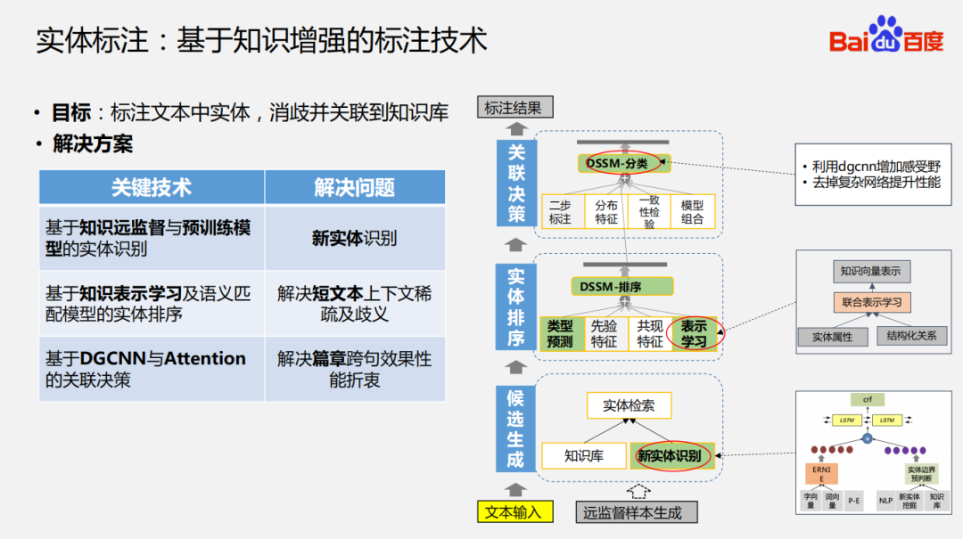 首先,先对输入的文本进行实体的识别,比如“李白这首歌好听吗?”,对于“李白”这个实体,它背后有很多候选实体,可能是诗人、歌曲、游戏里的英雄角色或者是普通的人。在候选实体中有一个很重要的问题——新实体的识别,这里面我们通过知识远监督的方式生成大量训练样本并且结合百度预训练模型ERNIE来提升新实体识别的效果。
