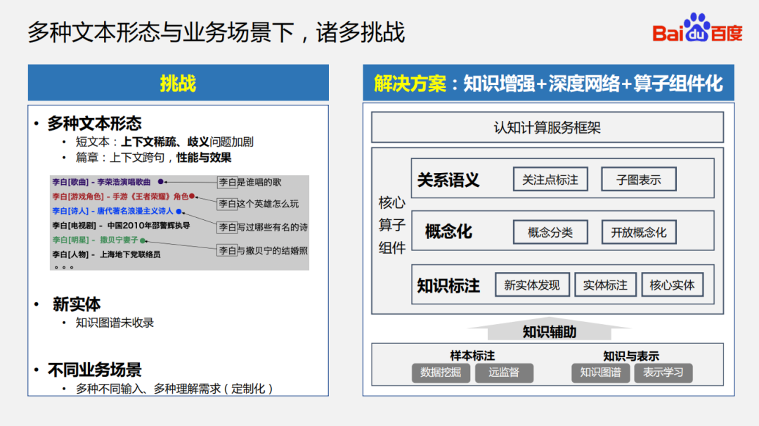 我们的解决方案是首先使用一些知识增强的技术去提升语义理解的效果,其次是深度神经网络,最后将一些核心算子进行抽象并组件化,通过组件化的方式定制化去支持不同的业务。