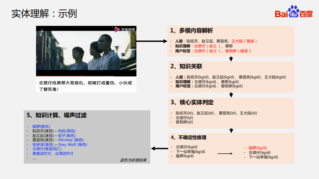 ③ 计算推理:实体计算扩展实体的属性关系;不确定性推理判断哪些实体在该视频中是最主要实体;冲突检测将不符合视频主旨内容的实体过滤。