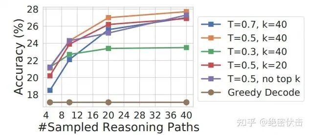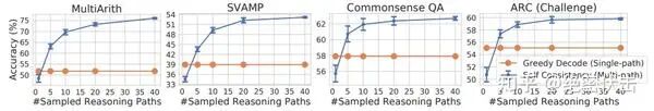 可以看到相比之前的单路径 CoT(图中的Single-path),Self-Consistency 显著提示了效果,而且随着采样个数的提升(图中的 Sampled Reasoning Paths对应图3.1的“采样不同的推理路径”),效果也不断变好。