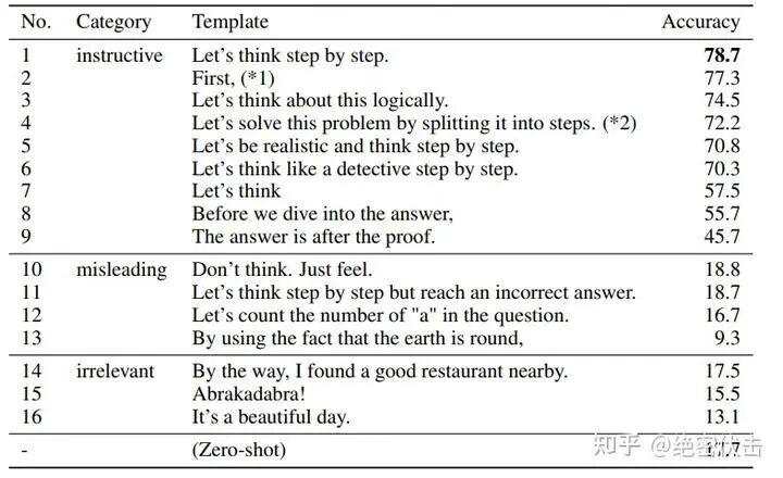 作者还做了解释,说明这句“Let’s think step by step”是经过验证的,比如对比下面的其它的 instruction,尤其那些不相关的和误导的,效果就非常差,说明大模型真的是在理解这句 instruction 的意思。