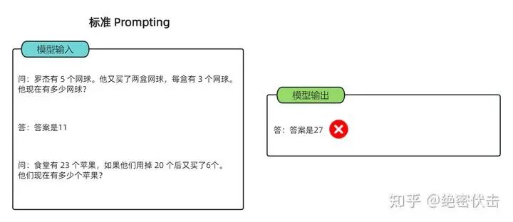 可以看到模型无法做出正确的回答。但如果说,我们给模型一些关于解题的思路,就像我们数学考试,都会把解题过程写出来再最终得出答案,不然无法得分。CoT 做的就是这件事,示例如下: