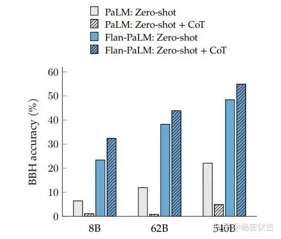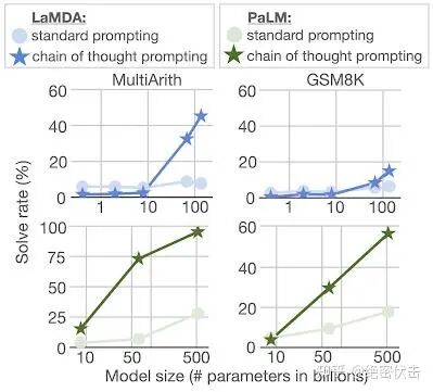 在 Jason Wei 等的研究中,PaLM 在扩展到 540B 参数时,与思维链提示结合,才表现出了先进的性能。一些小规模模型,思维链并没有太大的影响,能力提升也不会很大。