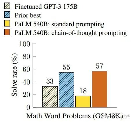 不难看出,在解数学问题上,同样使用 PaLM 这个 540B 的超级 LLM,CoT 的表现是传统 prompting 的300%以上,甚至超过了此前有监督的最优表现。
