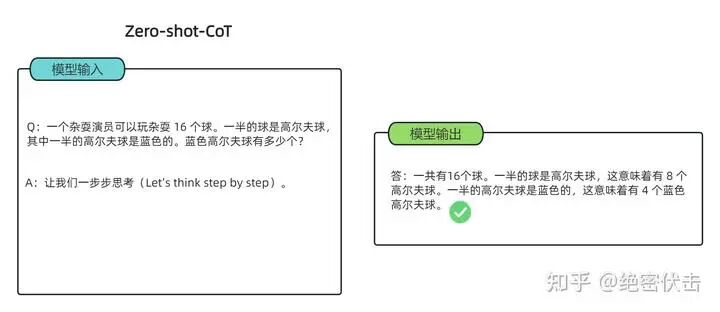 零样本思维链(Zero Shot Chain of Thought,Zero-shot-CoT)提示过程是对 CoT prompting 的后续研究,引入了一种非常简单的零样本提示。他们发现,通过在问题的结尾附加“Let’s think step by step”这几个词,大语言模型能够生成一个回答问题的思维链。从这个思维链中,他们能够提取更准确的答案。