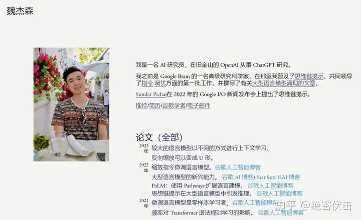 二是他的个人际遇,对 AI 影响很大,2022 年 2 月他离开谷歌,加入了 OpenAI,进入 ChatGPT 团队,这也是思维链在 OpenAI 发扬光大,让 ChatGPT 拔得头筹的原因之一。