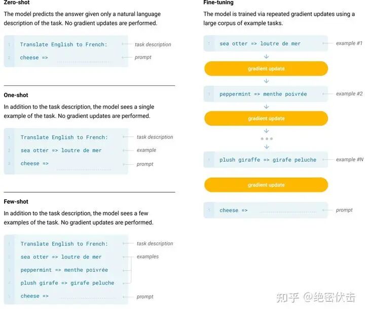 图1: zero-shot、one-shot、few-shot和微调方法的对比