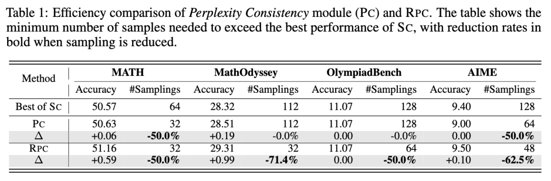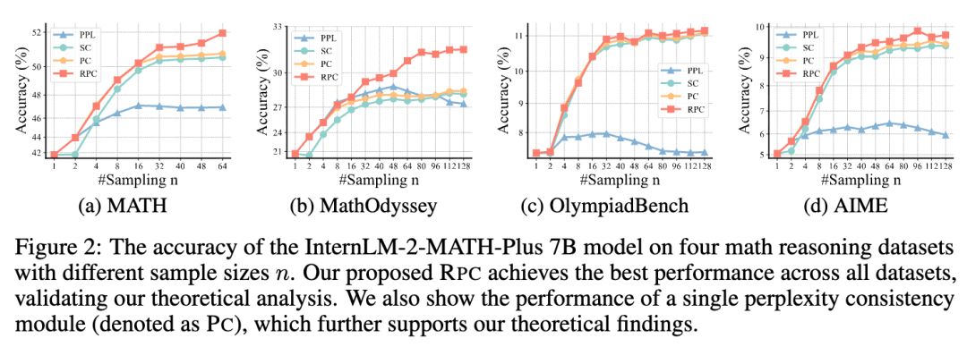 - 在 MATH 和 AIME 数据集上,RPC 仅用 SC 50% 的样本量就达到了超越 SC 的性能。
