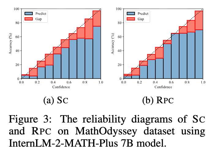 上图是 SC 和 RPC 在 MathOdyssey 数据集上的可靠性图。图中的蓝色条形代表每个置信度区间内模型的实际准确率,虚线代表理想的完美校准线。可以看到,RPC 的蓝色条形更贴近虚线,尤其是在高置信度区间,其“缺口”(Gap)远小于 SC。这直观地展示了 RPC 在置信度校准上的优势。
