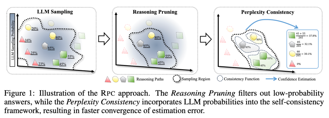 上图直观地展示了 RPC 的工作流程。首先,通过 LLM 采样得到一批带有内部概率的推理路径。然后,“推理剪枝”模块会过滤掉那些低概率的路径。最后,“困惑度一致性”模块在剩余的路径上计算每个答案的最终置信度。