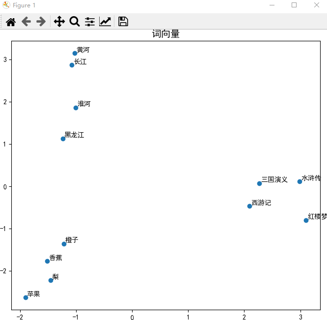 # 导入用于数值计算的库import numpy as np# 定义要可视化的单词列表words = ["西游记", "三国演义", "水浒传", "红楼梦", "苹果", "香蕉", "橙子", "梨", "长江", "黄河", "淮河", "黑龙江"]# 使用列表推导式获取每个单词的向量vectors = np.array([word_vectors[word] for word in words])