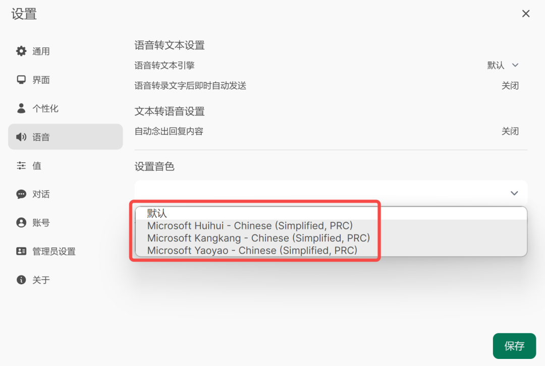 在个人设置这里,可以看到内置的 TTS 服务: