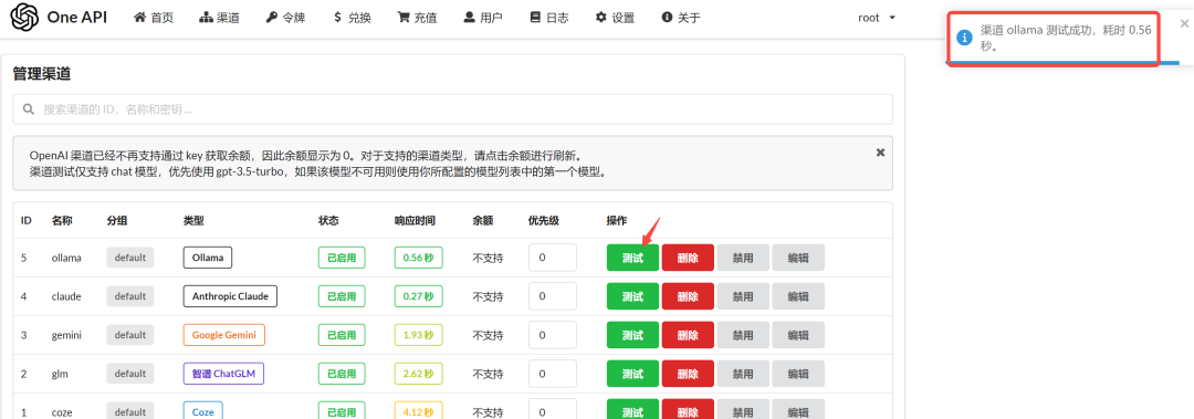 创建好之后,点击 测试 一下,右上角出现提示,说明已经配置成功,接下来就可以采用 OpenAI 的方式调用了。