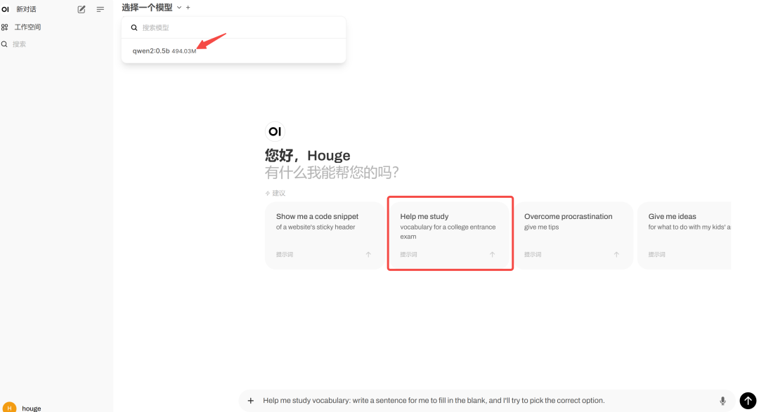 可以发现界面和 ChatGPT 一样简洁美观,首先需要选择一个模型,由于我们只部署了 qwen2:0.5b,于是先用它试试: