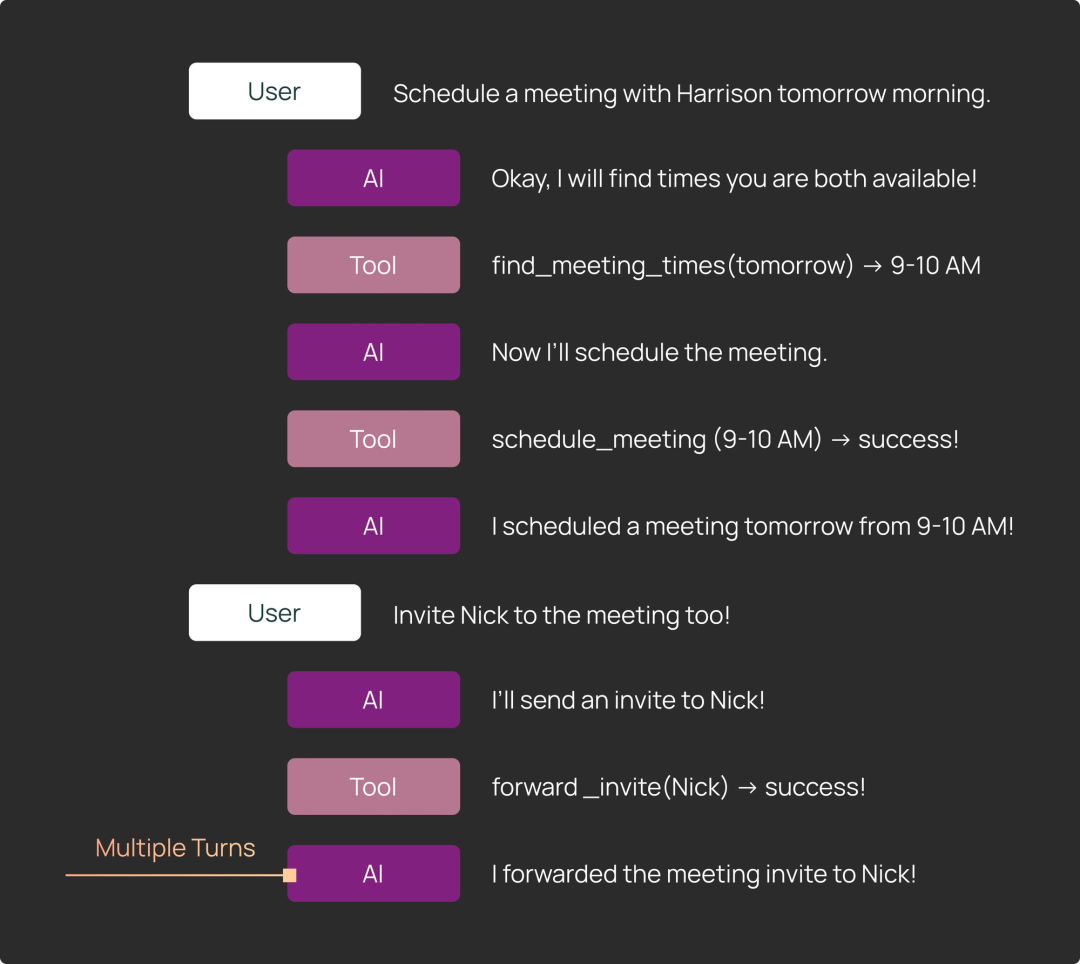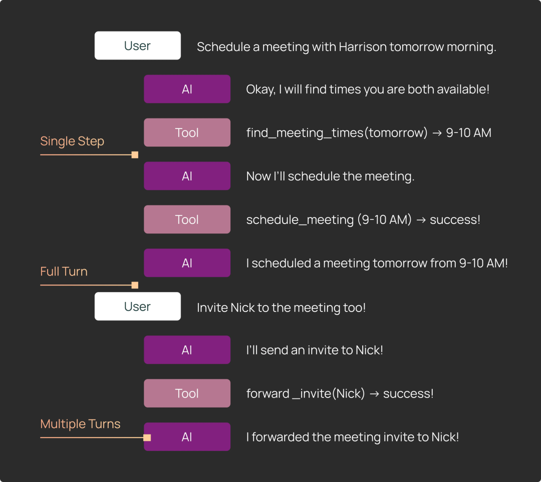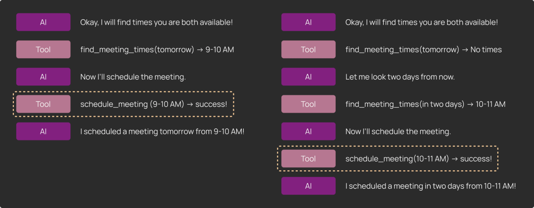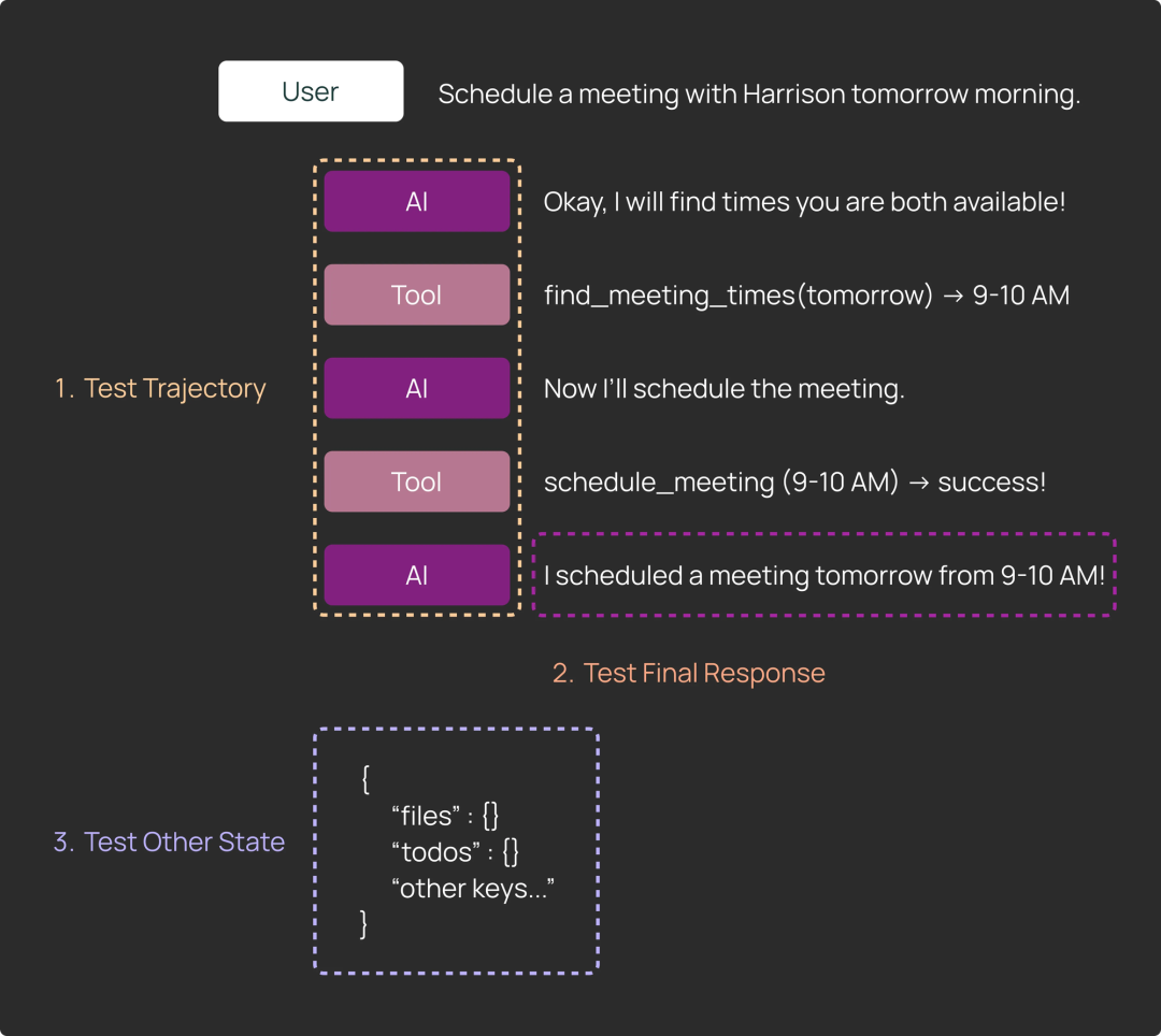 1) 执行轨迹: 评估完整轨迹的一个常见方法是确保某个特定工具在执行过程中的某个时刻被调用了,但不关心具体时机。在日历调度的例子中,调度器可能需要多次工具调用才能找到适合所有参与者的时间段。