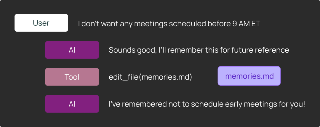 有个日历调度 agent,能记住用户偏好。用户说"记住,不要在早上 9 点前安排会议"。需要验证这个 agent 是否在文件系统中更新了自己的记忆。