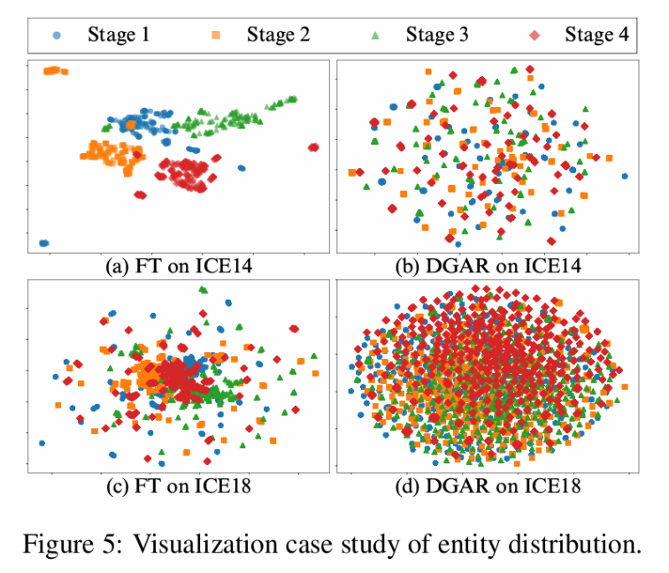 **可视化佐证:**实体特征分布经 DGAR 处理后更集中,跨时间阶段一致性强,证明分布冲突缓解效果。
