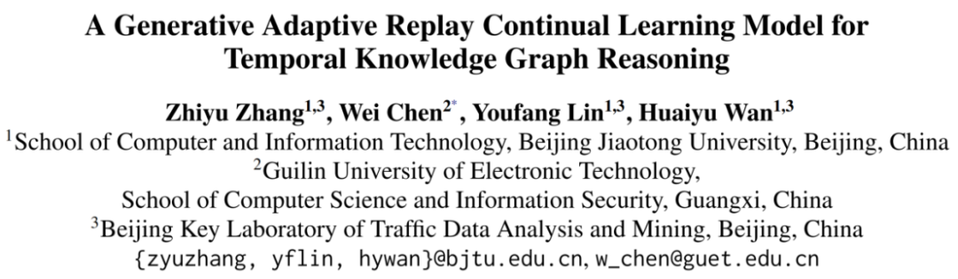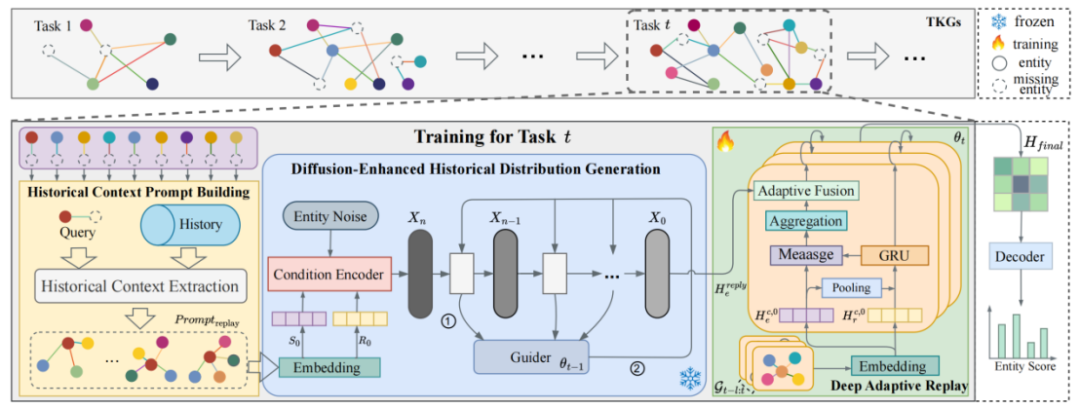 时序知识图谱(TKG)通过为三元组关联时间戳,拓展了传统知识图谱(KG)的动态表达能力,为大语言模型推理、事件预测、金融 forecasting 等下游任务提供结构化的时序知识支撑。但 TKG 常存在不完备性,时序知识图谱推理(TKGR)需基于历史知识推断缺失事实,而现实场景中 TKG 会持续新增实体、关系与事实,传统全量重训方式计算成本极高,持续学习(CL)微调虽高效却易引发灾难性遗忘。现有基于 CL 的 TKGR 方法仍存在两大核心局限:(1)仅片面重组单个历史事实,忽视理解事实历史语义所需的完整历史上下文,难以捕捉实体行为的整体趋势;(2)直接重放历史事实以保留知识,未考虑历史与新兴事实的分布冲突,削弱了灾难性遗忘的缓解效果。因此,本文提出深度生成式自适应重放(DGAR)方法,通过整合完整历史上下文、增强分布共性特征,在提升推理性能的同时高效缓解遗忘问题。