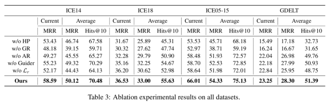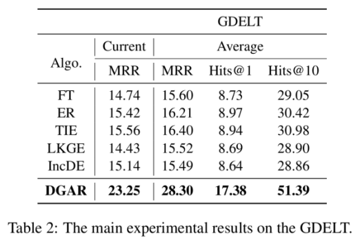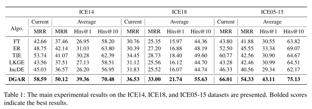 **主实验优势:**DGAR 在所有数据集、指标上均显著优于基线,GDELT(高频场景)中 Current MRR 从 15.56 提升至 23.25,历史任务平均性能提升超 20%,有效缓解灾难性遗忘:
