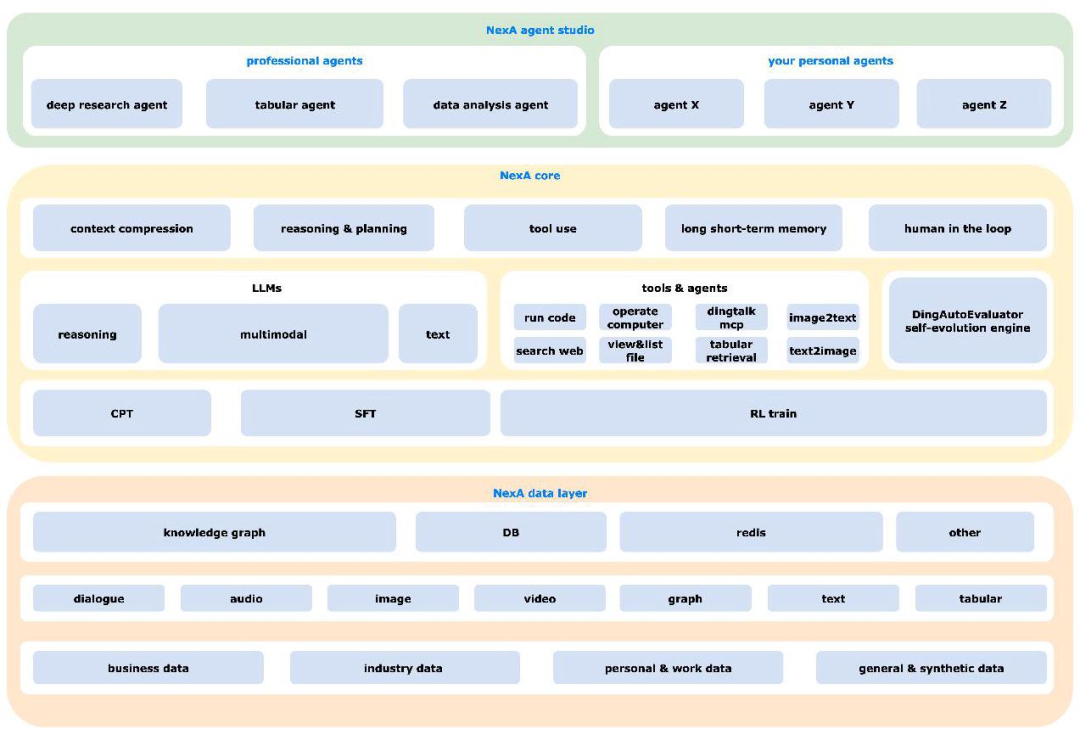 - Agent Studio层:提供可配置的专业和个人智能体,用于深度研究、表格处理和数据分析
