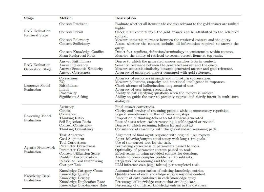 - 覆盖RAG、LLM、推理、智能体、知识库的多维度指标体系