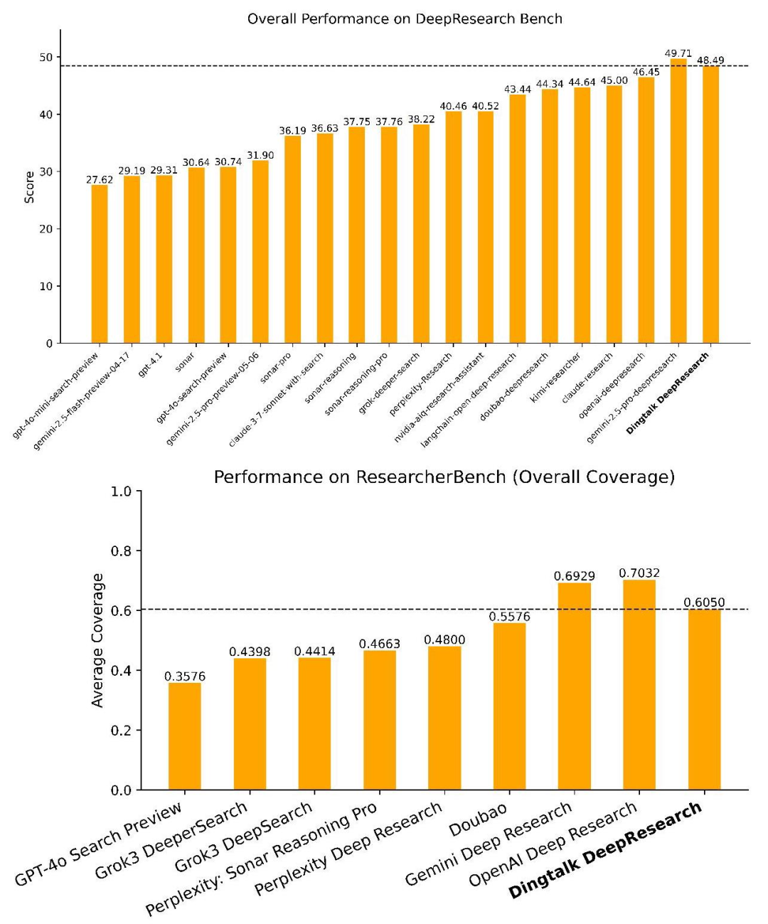 在ResearcherBench的整体覆盖率指标上,Dingtalk-DeepResearch达到了0.7032的平均覆盖率: