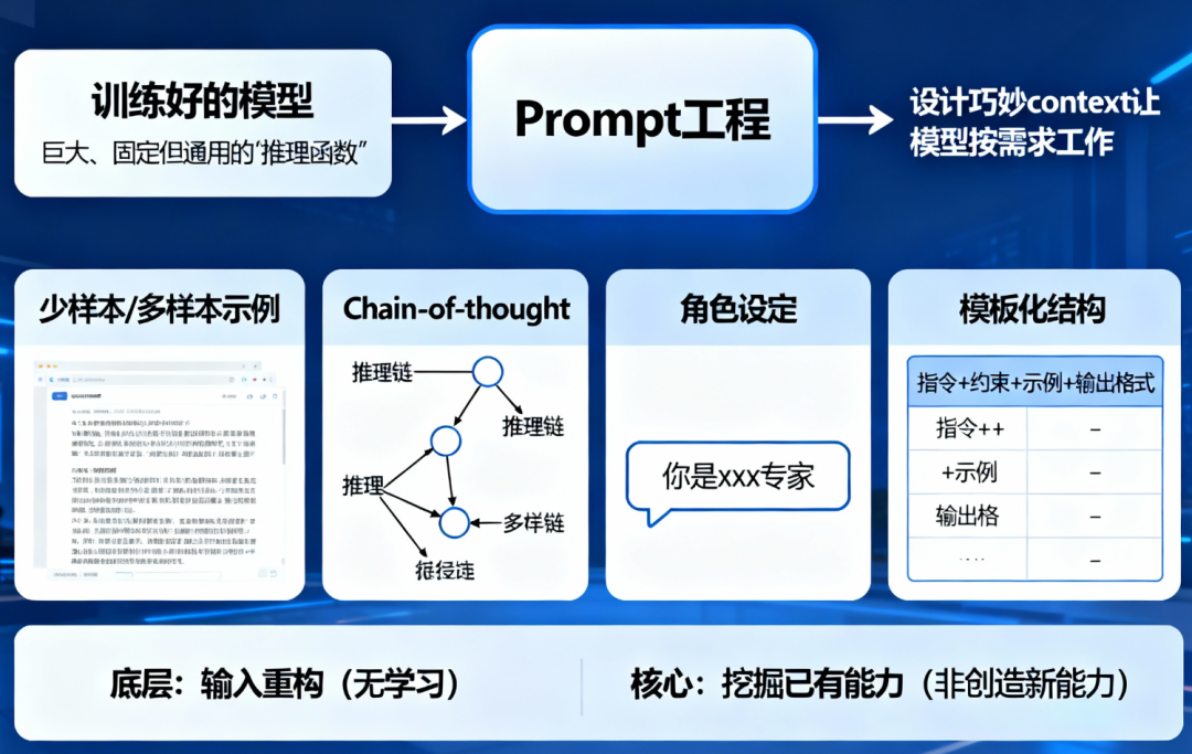 可以把已经训练好的模型看成一个巨大、固定但非常通用的推理函数。Prompt 工程做的事情其实只有一件:设计一个巧妙的context,让 fθ 以想要的方式工作。典型手段: