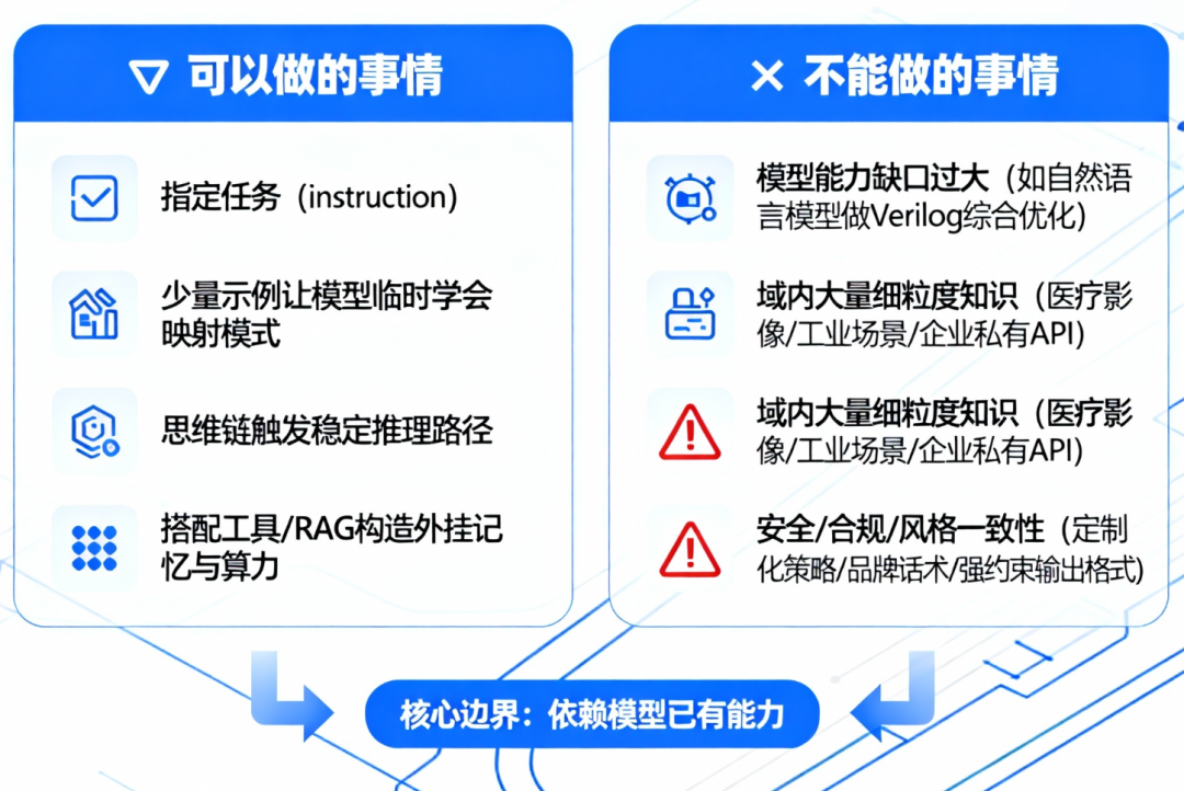同一个任务,如果通过训练(微调),prompt可以短得多,性能也更稳定。只靠prompt,需要提供大量示例和解释,浪费上下文和token,推理成本高。