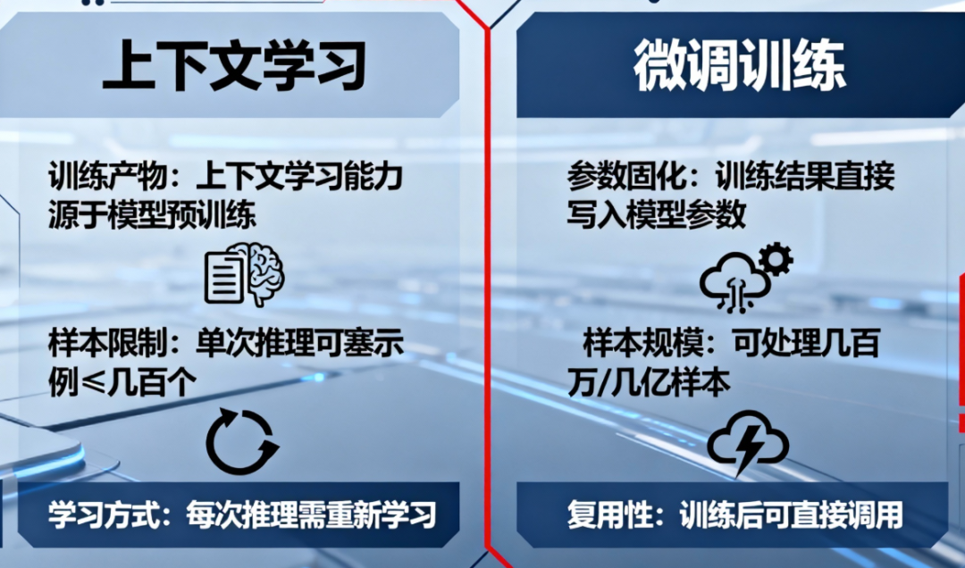 每次推理都要重新学习一遍:微调是学完写进参数,之后可以直接用。