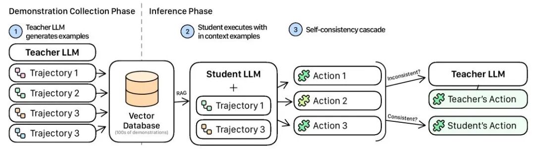 图1:上下文蒸馏与自洽级联的工作流。首先收集教师模型的示范存入数据库,推理时为学生模型检索相关范例,并通过自洽性检查决定是否求助教师模型。