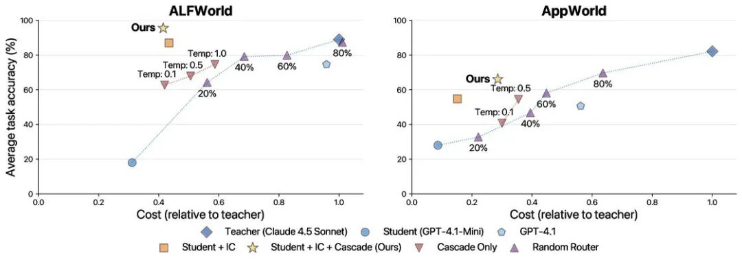 - 显著的成本降低:在ALFWorld上,该方法在达到甚至超越教师模型准确率的同时,实现了2.5倍的成本降低(单次任务成本从降至0.024)。在更复杂的AppWorld上,也达到了同等准确率下2倍的成本降低。