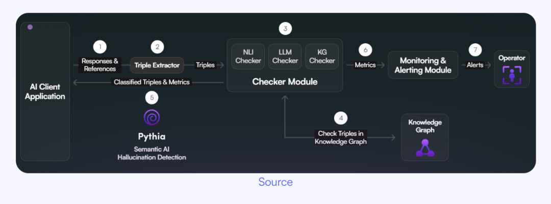 LLM面临的最重大挑战之一是它们倾向于生成看似真实但事实上不正确的信息(幻觉)。Pythia通过其实时幻觉检测模块来解决这个问题,该模块立即识别并标记此类错误。