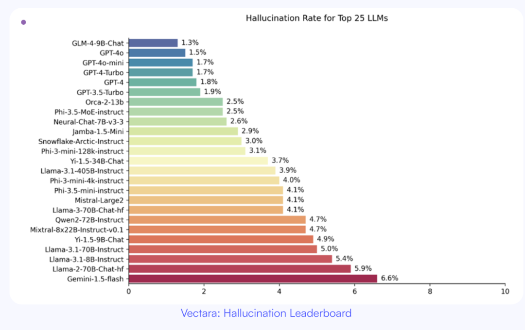 根据Vectara的幻觉排行榜数据,即使是最流行的LLM——如GPT、Llama、Gemini和Claude——也会在2.5%至8.5%的时间内产生幻觉,某些模型的幻觉率甚至超过15%。