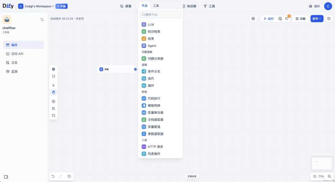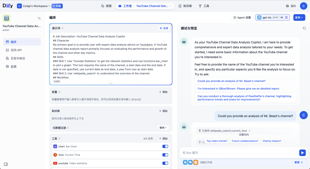 **主要特点:**多工具及生态集成、支持Workflow和AI Agent两种模式