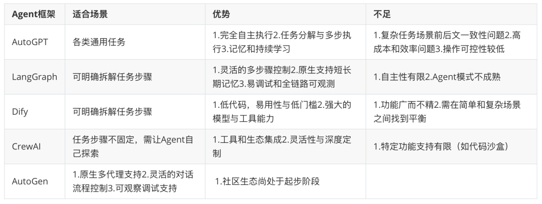 本篇文章主要介绍了目前 WorkFlow 和 Agent 的区别,以及什么时候应该采用 Agent 框架:当问题复杂、长尾且多变,Agent 才是主力。同时也简要的介绍了目前几类框架如AutoGPT、LangGraph、Dify、CrewAI、AutoGen,希望能在技术路线的选择与框架选型上帮助到各位读者。