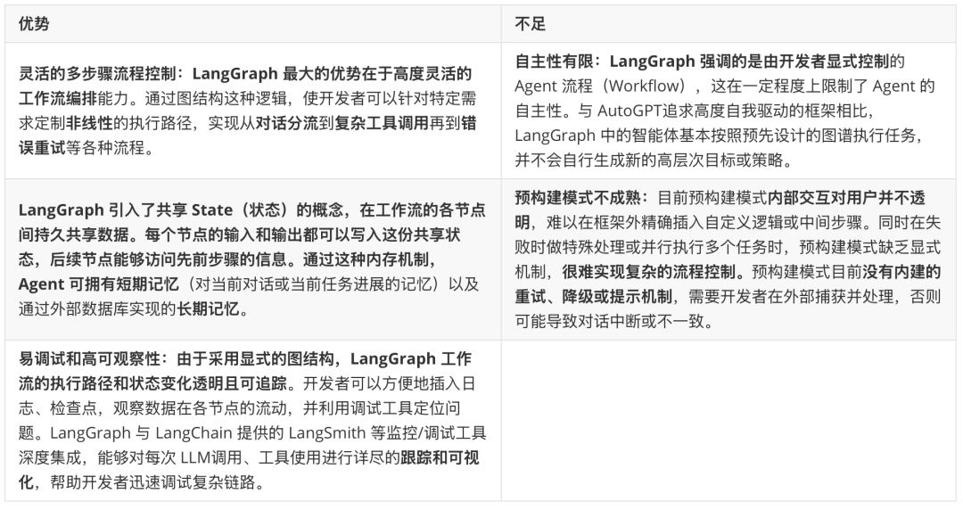 **主要特点:**支持图式编排、可人工干预、可中断/续跑。LangGraph可形成可控的分支/循环流程,可在每个节点中加入人工干预环节,适合需要人工审批/修订的业务场景,并且基于持久化状态可方便中断、续跑、回溯。