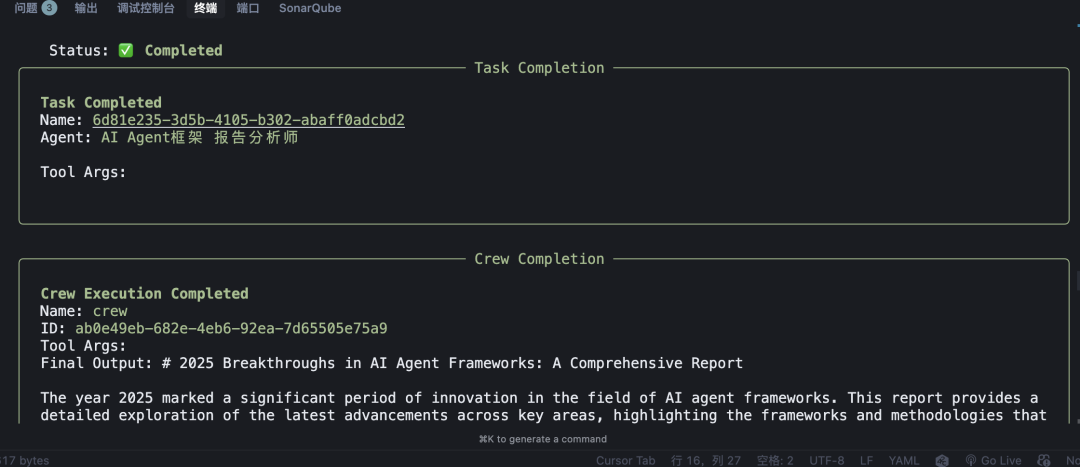 **简介:**CrewAI 是一个多智能体(multi-agent)编排框架,其核心理念是让多个具备特定角色的 AI 代理协同合作(组成“crew”团队)来完成复杂任务。每个代理被赋予特定的角色、目标和背景知识,通过相互分工与配合,自动地进行任务委派和问询,最终以团队形式完成用户交给的工作。