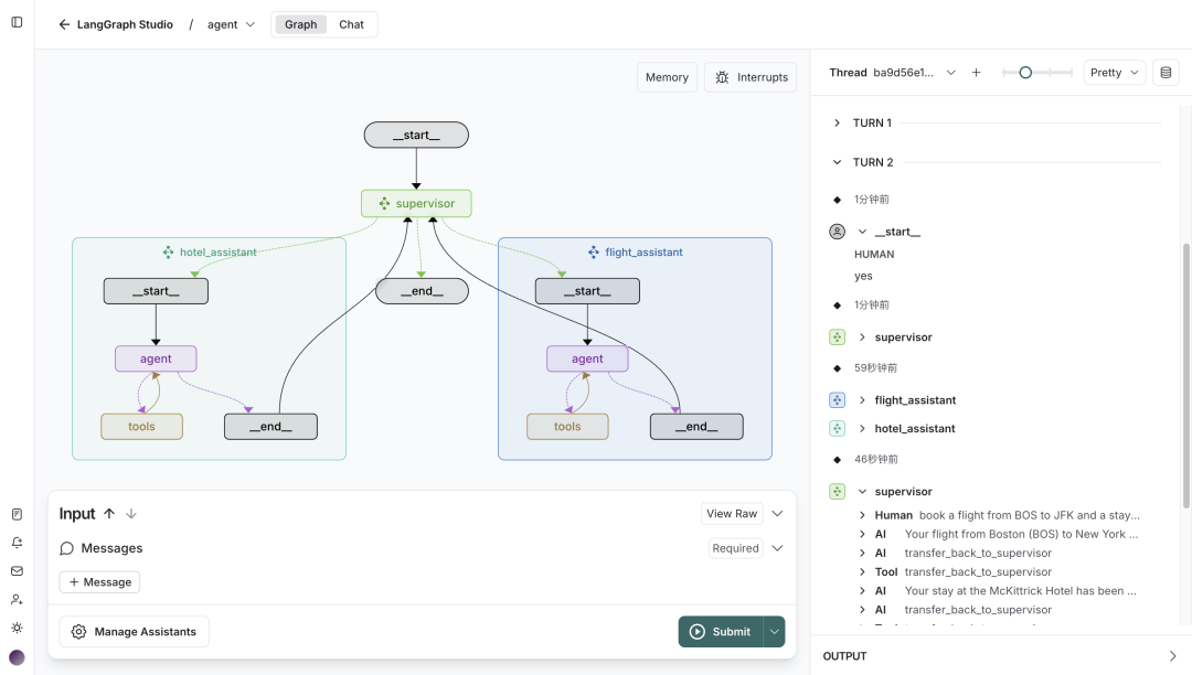 又定义了一个 Supervisor agent ,来管理flight_assistant和hotel_assistant两个子Agent工作。