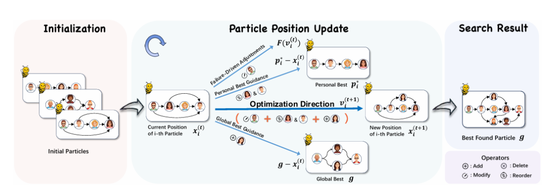 - 粒子=智能体系统:每个粒子对应一个候选智能体系统,位置以结构化语言编码系统配置(智能体集合+协作结构);