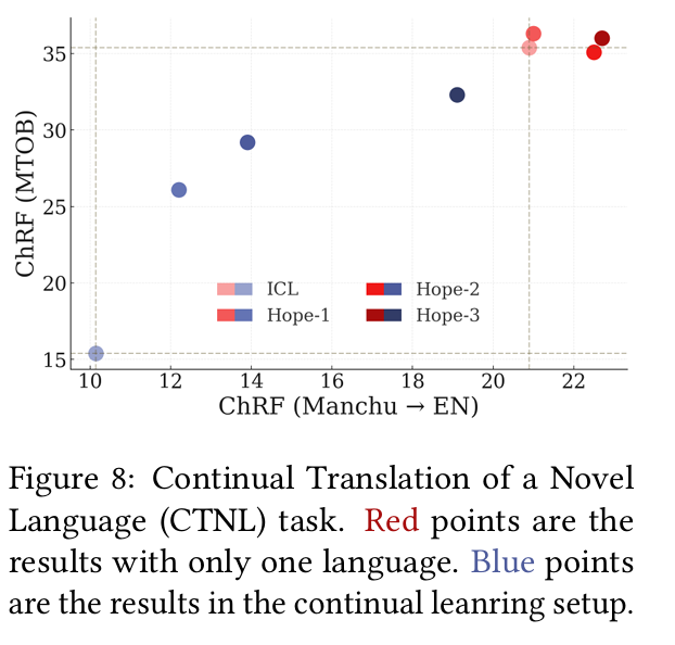 研究团队结合MTOB和 Manchu两个基准,设计了一项名为“新语言的持续翻译”(CTNL)的新任务:大语言模型需在上下文中依次学习两种低资源语言(Manchu 和 Kalamang),并将其短语翻译成英语。实验包含两种设置:一是独立学习每种语言作为基线(红色),用于衡量灾难性遗忘;二是顺序学习两种语言后再测试(蓝色)。以标准 ICL 为对照,构建了 HOPE-1/2/3 三种变体,分别引入 1 至 3 个额外记忆层级。